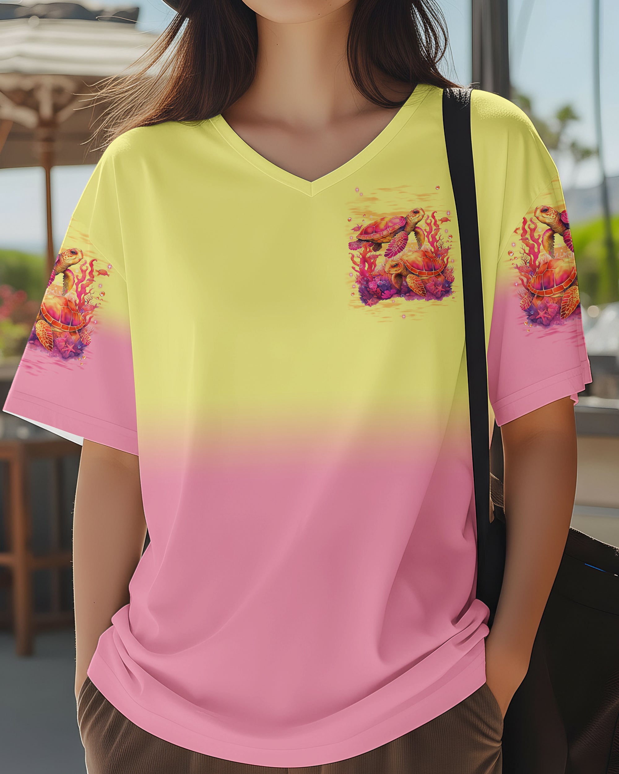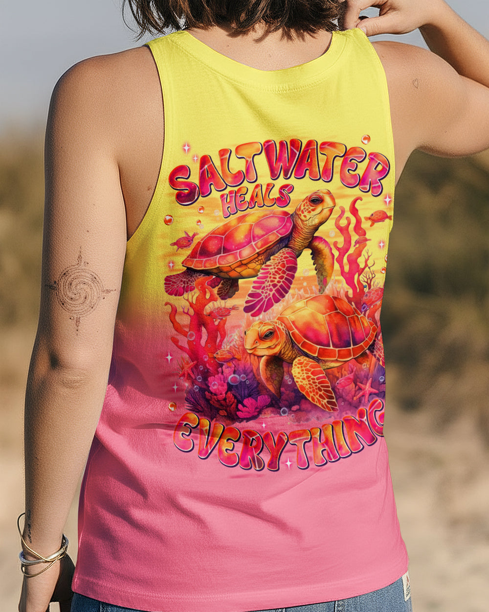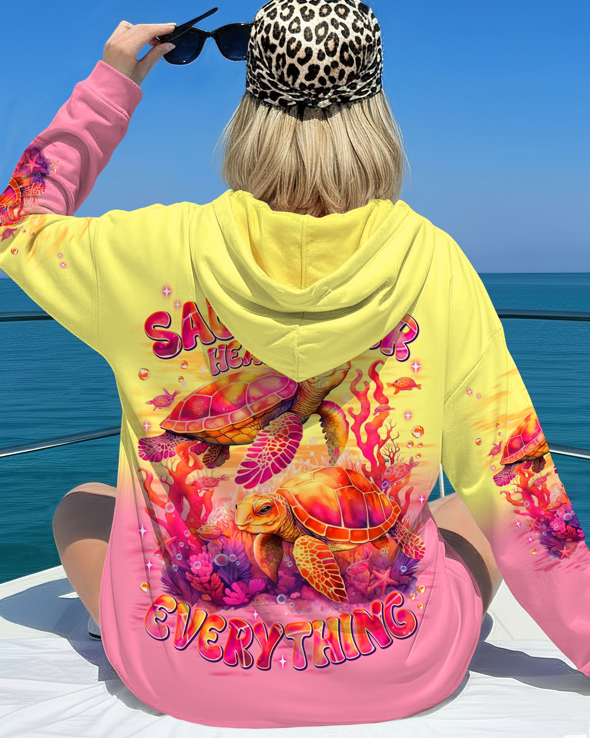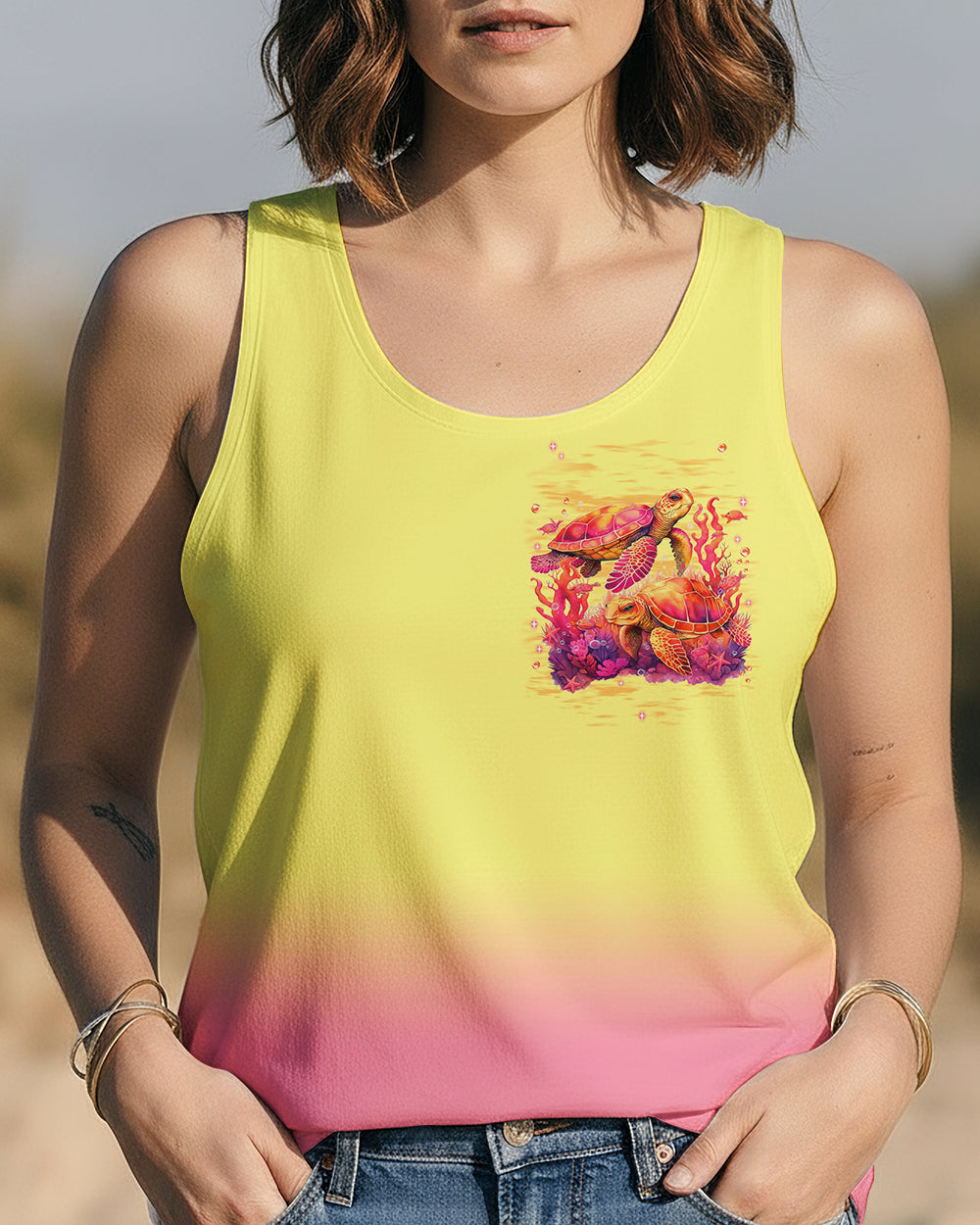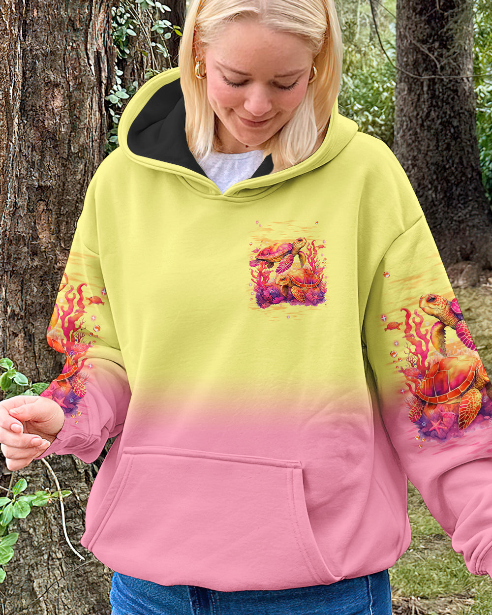 Immerse yourself in the therapeutic essence of the ocean with this all-over print design featuring two graceful turtles gliding through vibrant coral reefs. Rendered in soft marine hues with flowing, dynamic motion, this piece captures the restorative power of saltwater and coastal living. The composition evokes a profound sense of calm and balance, reminding wearers that the sea possesses an innate ability to dissolve stress, facilitate healing, and awaken inner peace. Ideal for those who draw strength and solace from ocean environments, this design celebrates the transformative connection between salt air, endless horizons, and personal renewal.