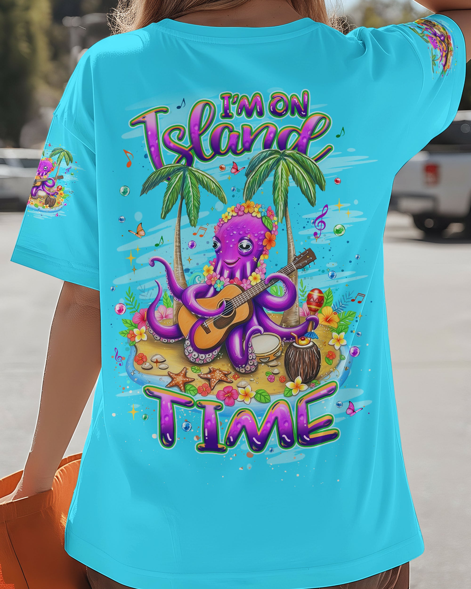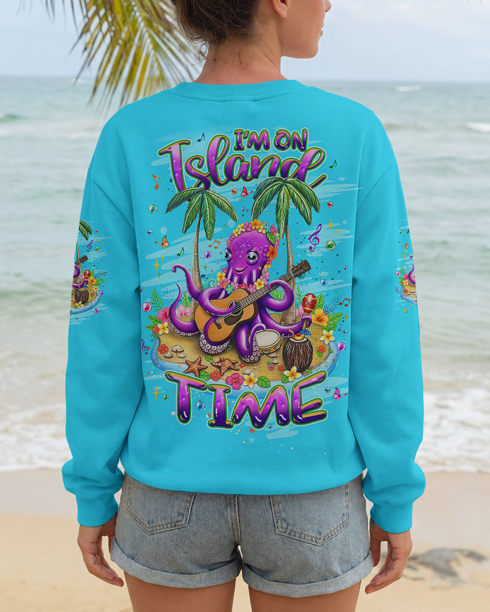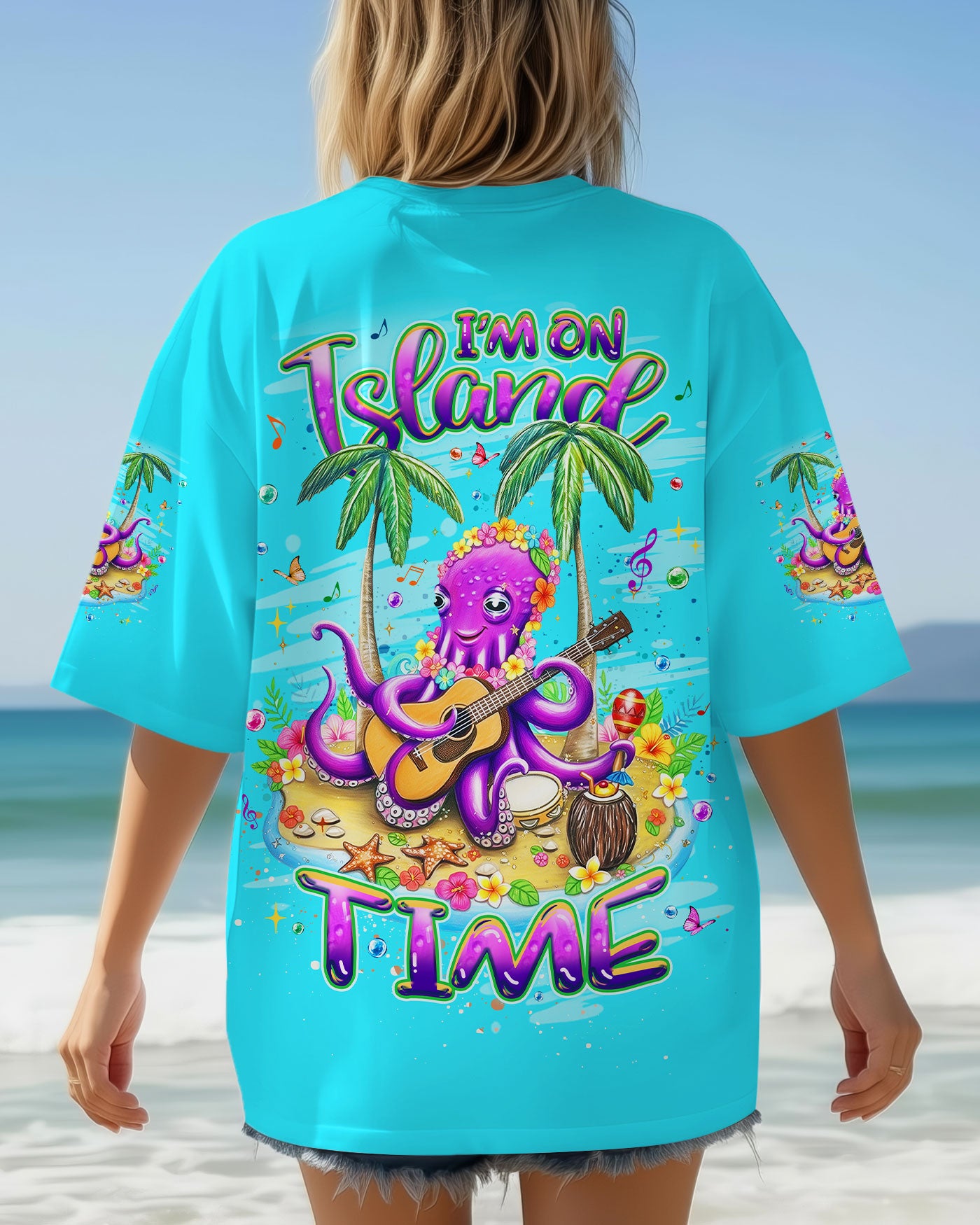 Embrace the carefree essence of island living with this vibrant all-over print featuring a cheerful octopus adorned with blooming sea-floral necklaces, making music beneath swaying palms. Starfish and butterflies dance through an ocean-inspired palette that radiates playful energy and coastal joy. This design captures the philosophy of island time—a deliberate shift toward prioritizing happiness and releasing stress with each passing tide. Perfect for those who understand that true wealth lies in slowing down, savoring moments, and aligning life's rhythm with nature's unhurried pace. A wearable celebration of freedom, lightness, and the transformative power of embracing a slower, more intentional way of being.