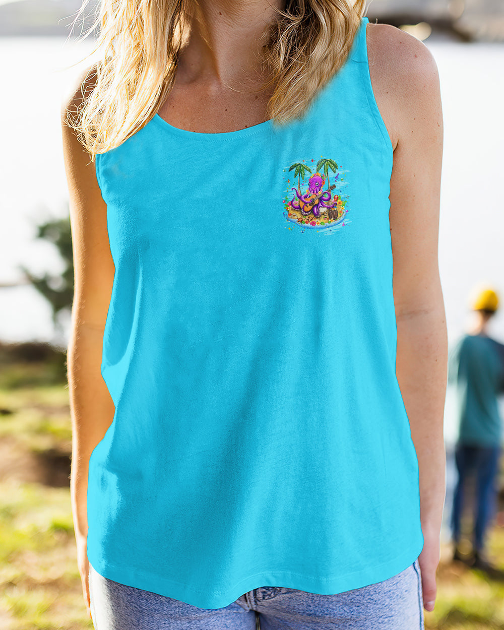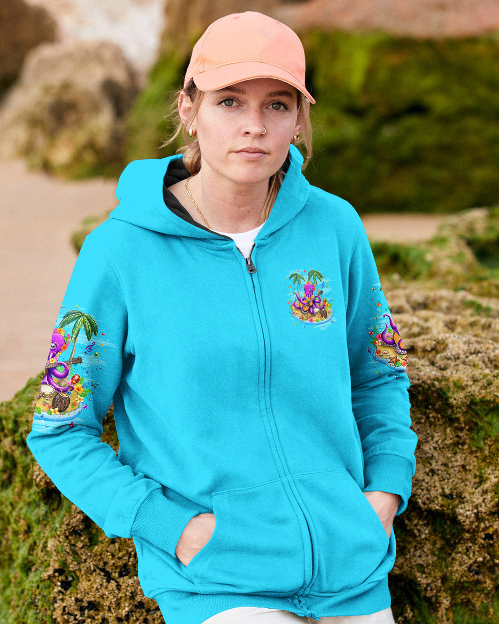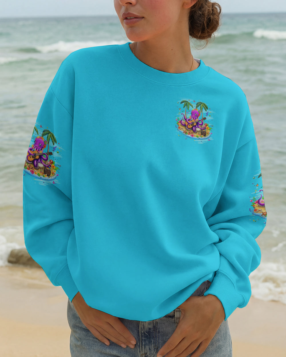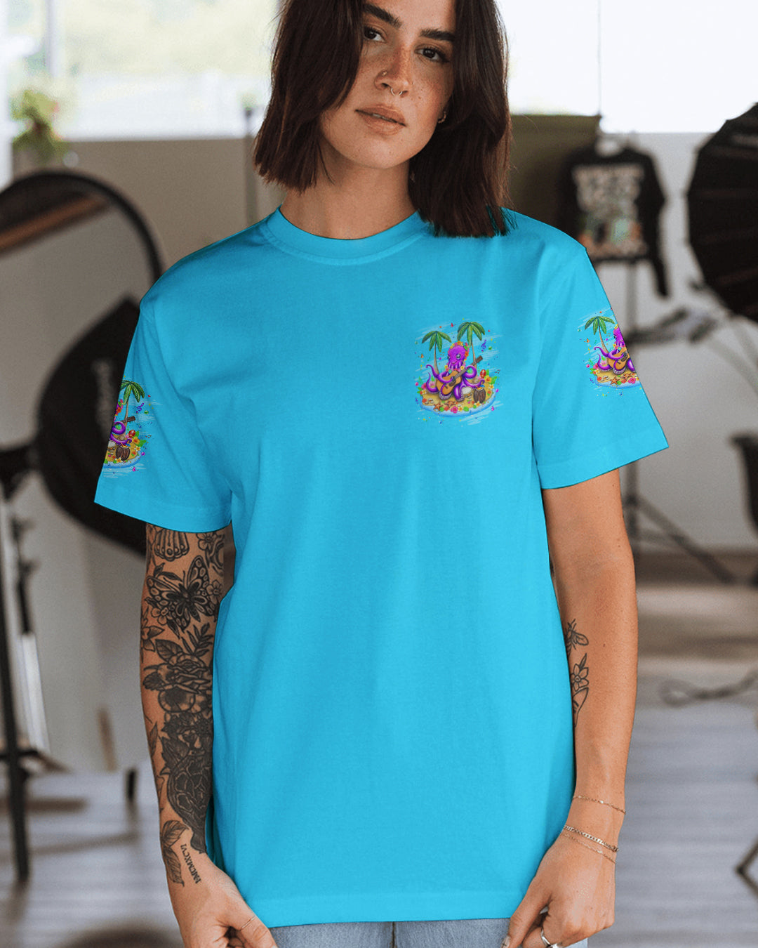 Embrace the carefree essence of island living with this vibrant all-over print featuring a cheerful octopus adorned with blooming sea-floral necklaces, making music beneath swaying palms. Starfish and butterflies dance through an ocean-inspired palette that radiates playful energy and coastal joy. This design captures the philosophy of island time—a deliberate shift toward prioritizing happiness and releasing stress with each passing tide. Perfect for those who understand that true wealth lies in slowing down, savoring moments, and aligning life's rhythm with nature's unhurried pace. A wearable celebration of freedom, lightness, and the transformative power of embracing a slower, more intentional way of being.