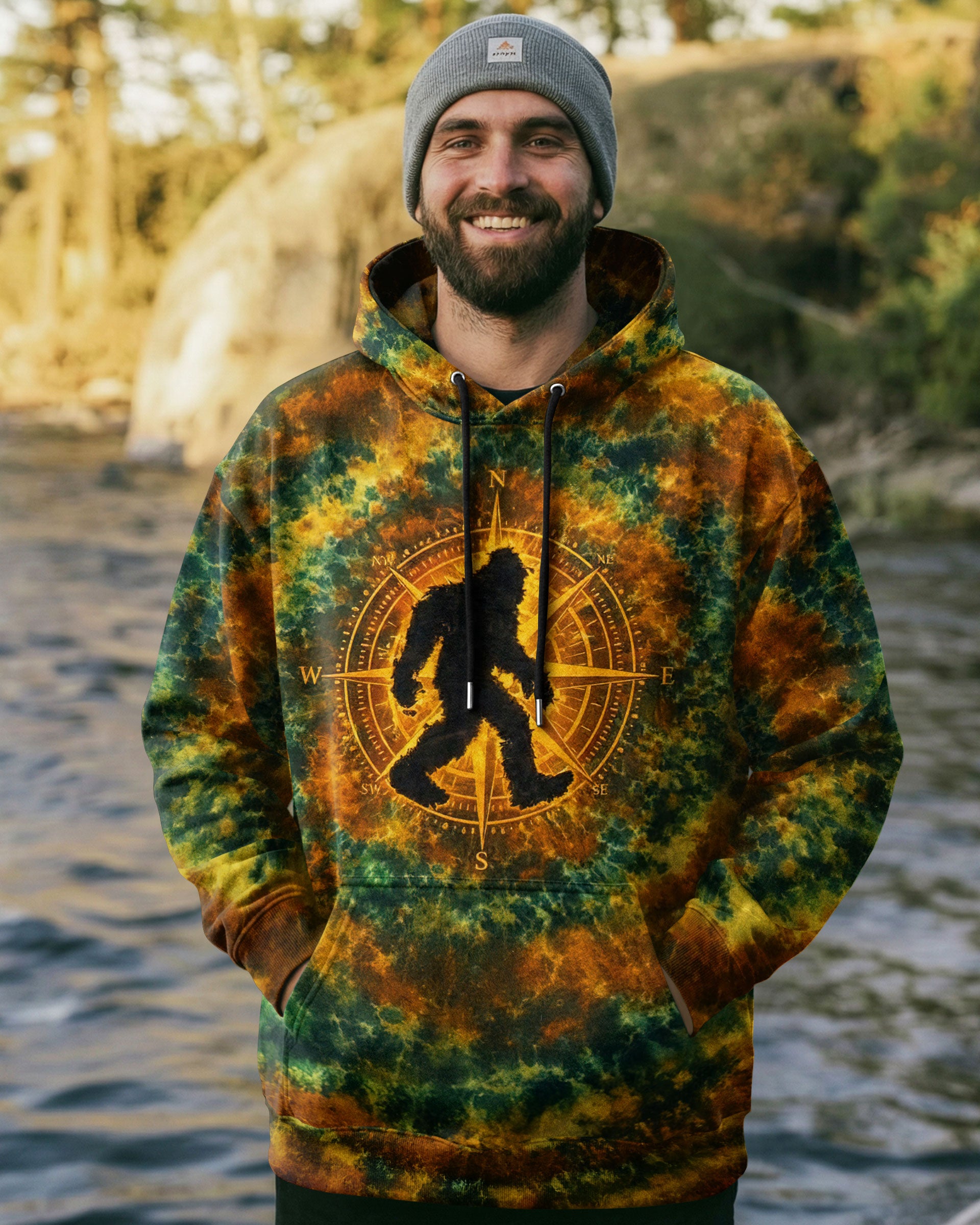 This striking all-over print features a bold Bigfoot ascending a ladder, guided by a prominent compass symbol that anchors the composition. The design embodies the essence of self-directed exploration and the courage required to forge your own path through uncharted territory. Rendered in dynamic tie-dye tones, the artwork celebrates intuitive navigation, independence, and the adventurous spirit of those who thrive beyond conventional boundaries. Crafted for wanderers, trailblazers, and free-spirited explorers who trust their instincts and embrace the transformative power of venturing into the unknown.